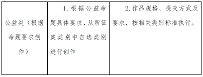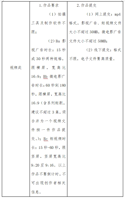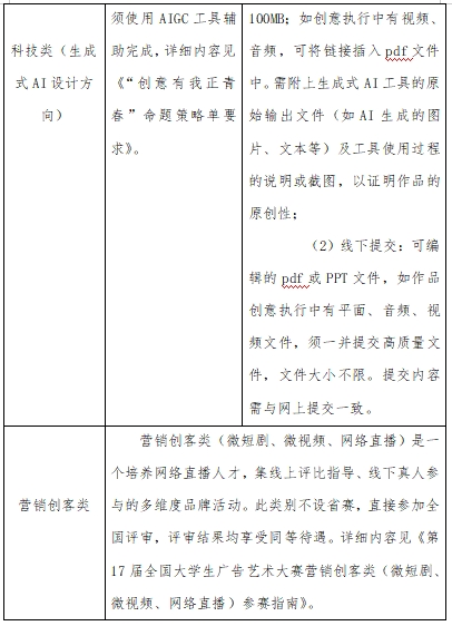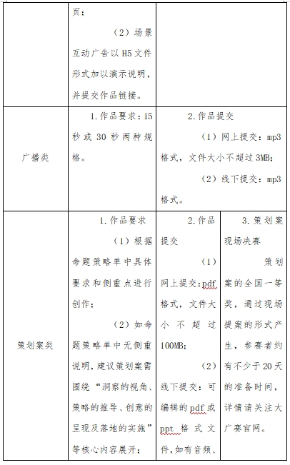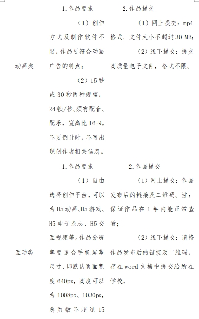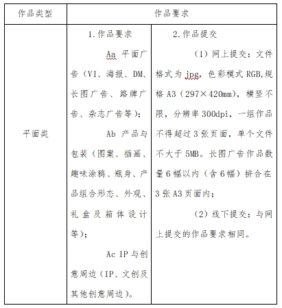 参赛作品分为平面类(Aa平面广告、Ab产品与包装、Ac IP与创意周边);视频类(Ba影视广告、Bb微电影广告、Bc短视频);动画类互动类(移动端H5广告、场景互动广告);广播类;策划案类;文案类(长文案、创意脚本);UI类(移动端、PC端);科技类(生成式AI设计方向);营销创客类(Ja微短剧、Jb微视频、Jc网络直播);公益类(根据命题要求创作)。