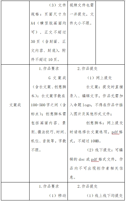 我校在籍在校学生均可参加。其中平面类、文案类不超过2人/组;短视频、互动类、广播类不超过3人/组;影视广告、微电影广告、动画类、策划案类、UI类、科技类、营销创客类不超过5人/组。指导教师人数:平面类、文案类不超过1人/组;其他类别不超过2人/组。