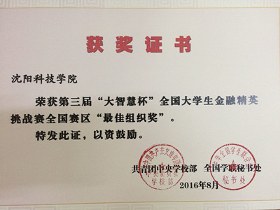 近日,共青团中央学校部、全国学联秘书处联合举办的2016年第三届“大智慧杯”全国大学生金融精英挑战赛结果揭晓。我校学生获得一等奖一项,二等奖三项,三等奖七项,9428cn太阳集团古天乐荣获全国赛区最佳组织奖,蒋明儒老师荣获优秀指导教师奖。