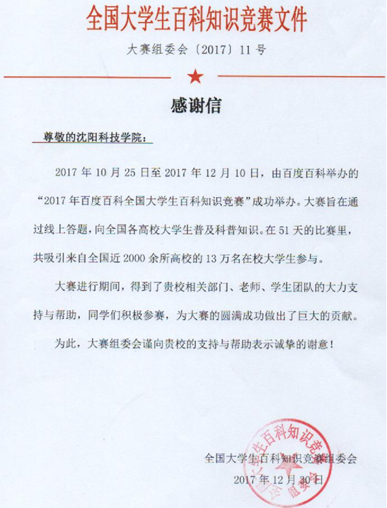 据悉,“2017年百度百科全国大学生百科知识竞赛”是由百度百科发起,全国各高校团委、学生会等学生组织以及百度百科校园俱乐部等共同承办的全国性知识竞赛。此次大赛持续51天,共吸引来自全国近2000余所高校的13万名在校大学生参与。同时,我校团委也收到了来自全国大学生百科知识竞赛组委会的感谢信,这不仅是对我校共青团工作的肯定,也将激励更多的大学生提高自身素质,拓宽知识视野,丰富课余生活,全面发展,锐意进取,让大学生们能更加深入的认识到知识的快乐和乐趣,从而在知识的海洋中展现睿智的青春,彰显迷人的风采。