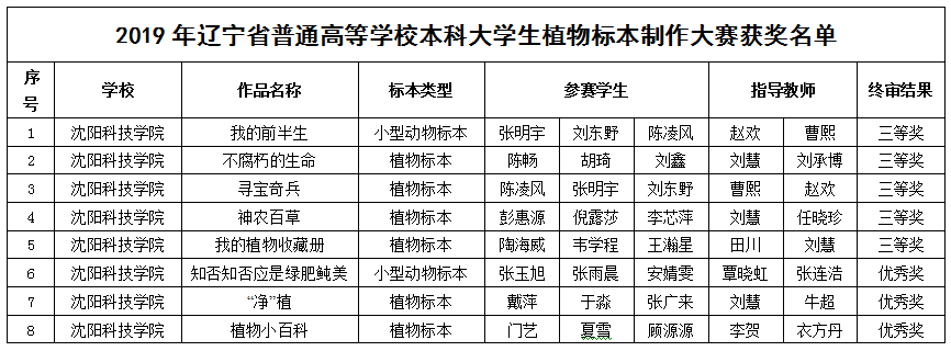 11月9日,2019年辽宁省大学生动植物标本大赛决赛在沈阳农业大学海城教学实习基地落下帷幕。经过评审组严格评选,我校在本届大赛中获得三等奖5项,优秀奖3项的成绩。