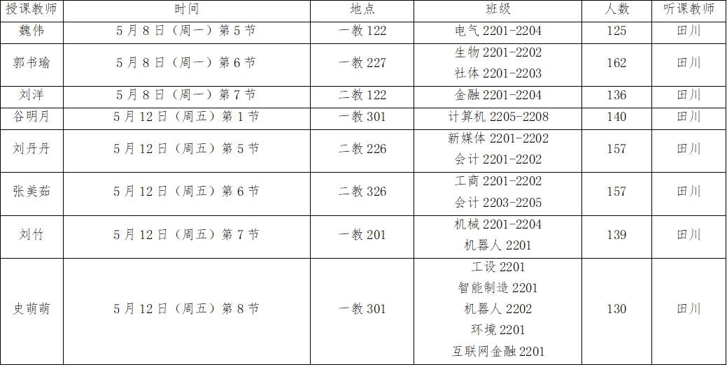 注:上面表格为创新创业教育学院授课教师信息,请各位授课教师根据时间安排自行听课并填写听课表,每位任课教师至少听一次课。听课时间在:第九周4月24日——第十二周5月17日之间。听课评议表可到创新创业教育学院或教务处领取。