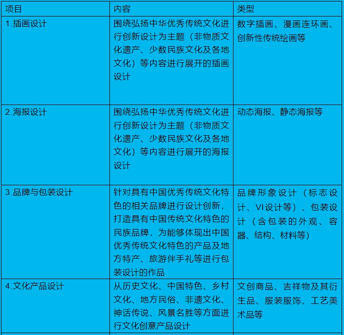 近三年创作的有关中华优秀传统文化创新设计的有关作品,且具有自主知识产权的原创作品均可报名(注:已在其他大赛获奖或已被采用作品不能参赛)